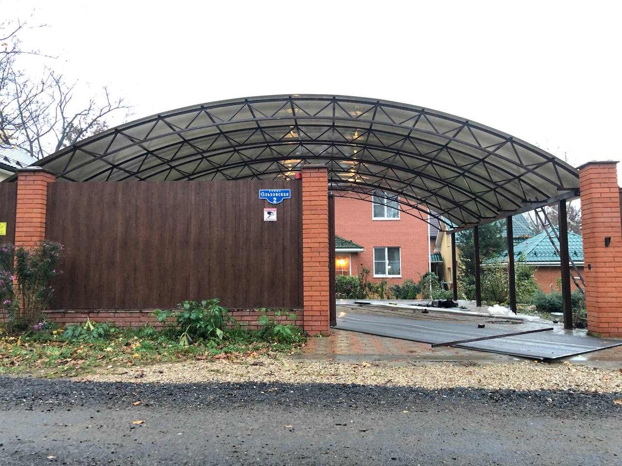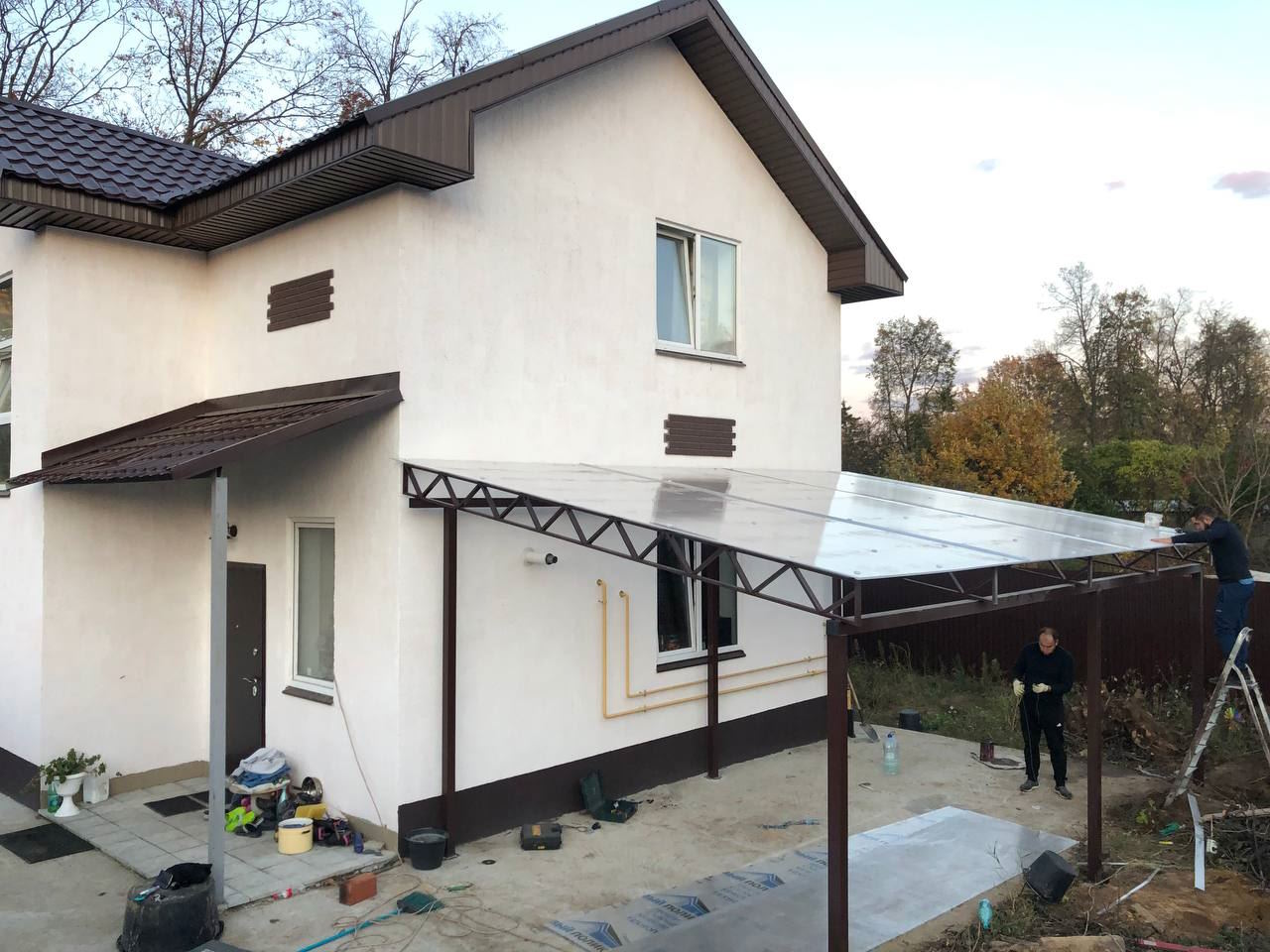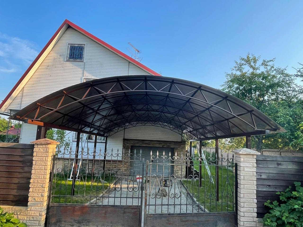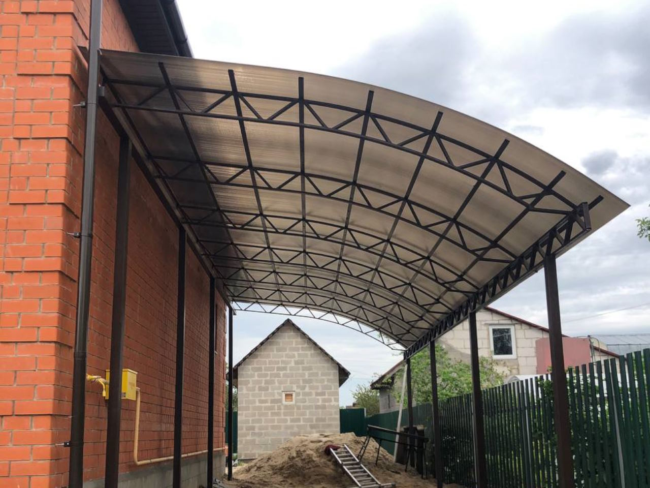 За день на даче изготовили арочный навес 5 на 7 с покрытием поликарбоната. Привезли уже готовые крашенные фермы и весь остальной материал. Все за собой убрали и увезли мусор. Молодцы!
